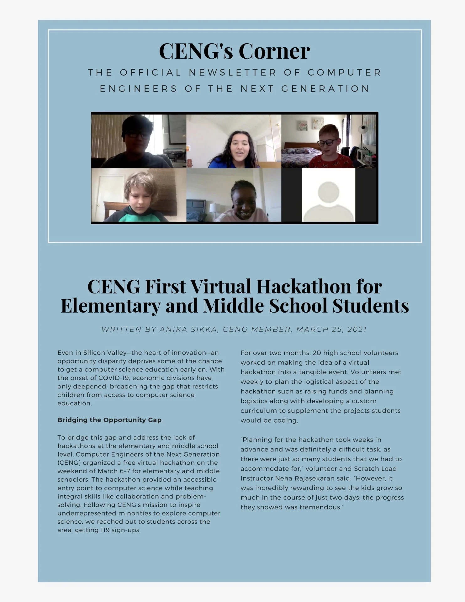 CENG's First VIRTUAL Hackathon for Elementary and Middle School Students